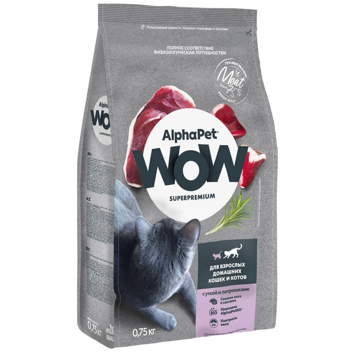 ALPHAPET WOW SUPERPREMIUM сухой корм для взрослых стерилизованных кошек и котов с уткой и потрошками 750г х 1 шт