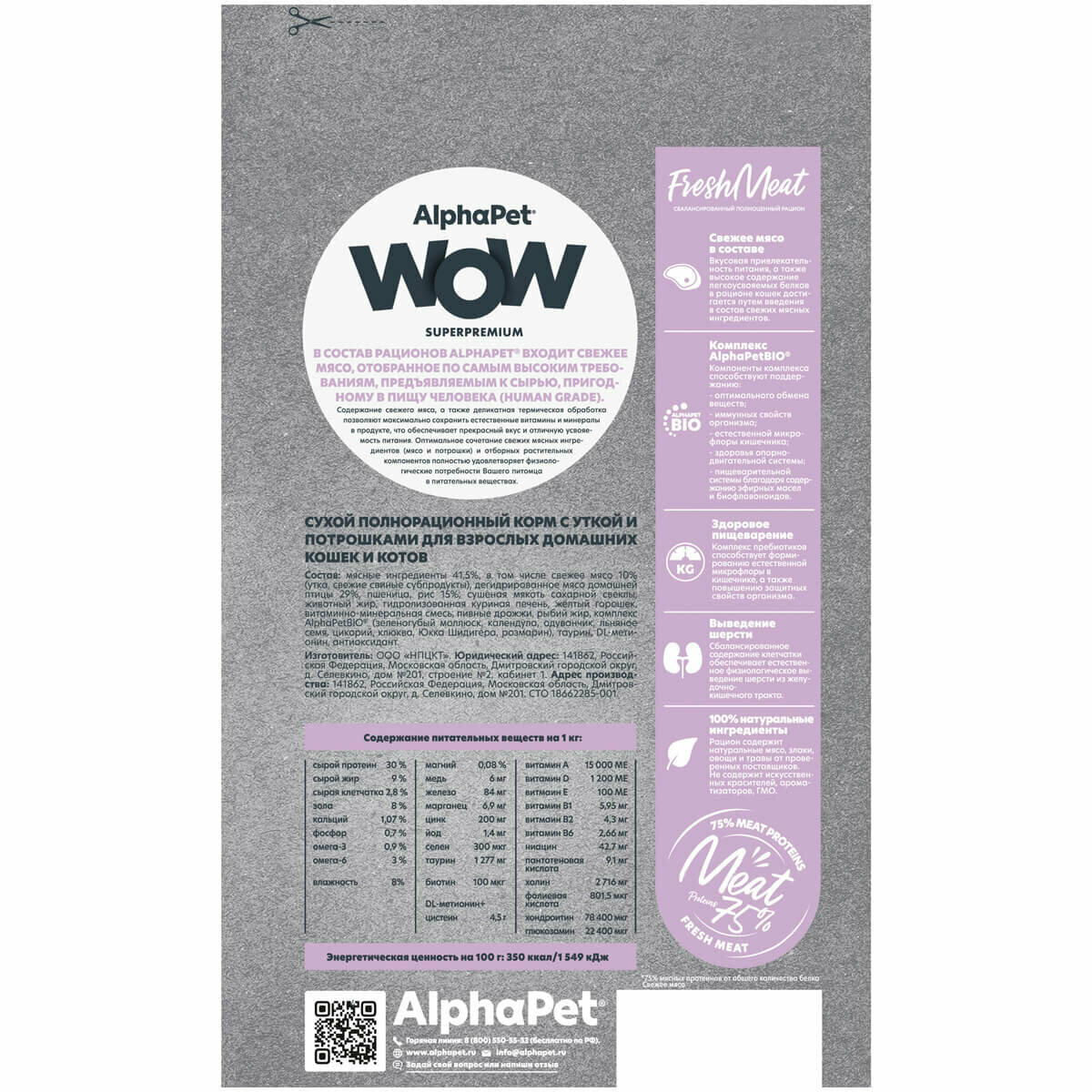 Корм сухой Alphapet Superpremium WOW, с уткой и потрошками для взрослых домашних кошек и котов, 1,5 кг