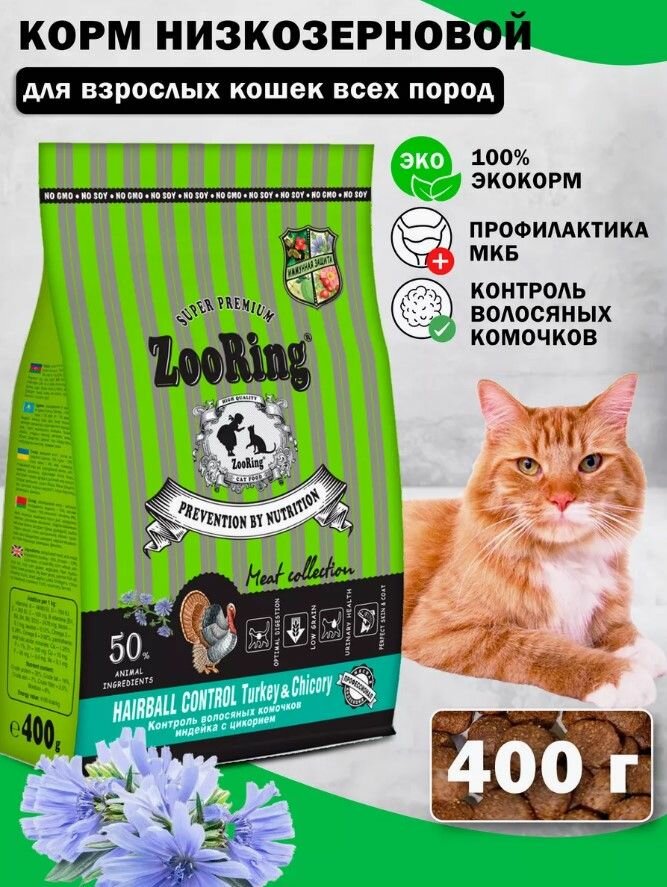 Купить ZooRing Корм сухой для кошек Adult Cat Hairball Control Turkey&Chicory Индейка с цикорием, 0,4кг