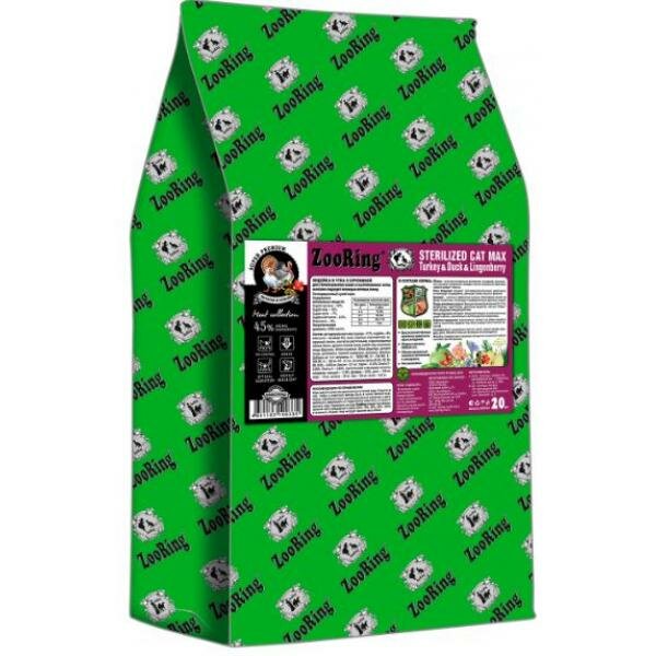 Сухой корм Зооринг / ZooRing Sterilized Cat Max Turkey & Duck & Lingonberry. для стерилизованных кошек, индейка и утка с брусникой, 10 кг