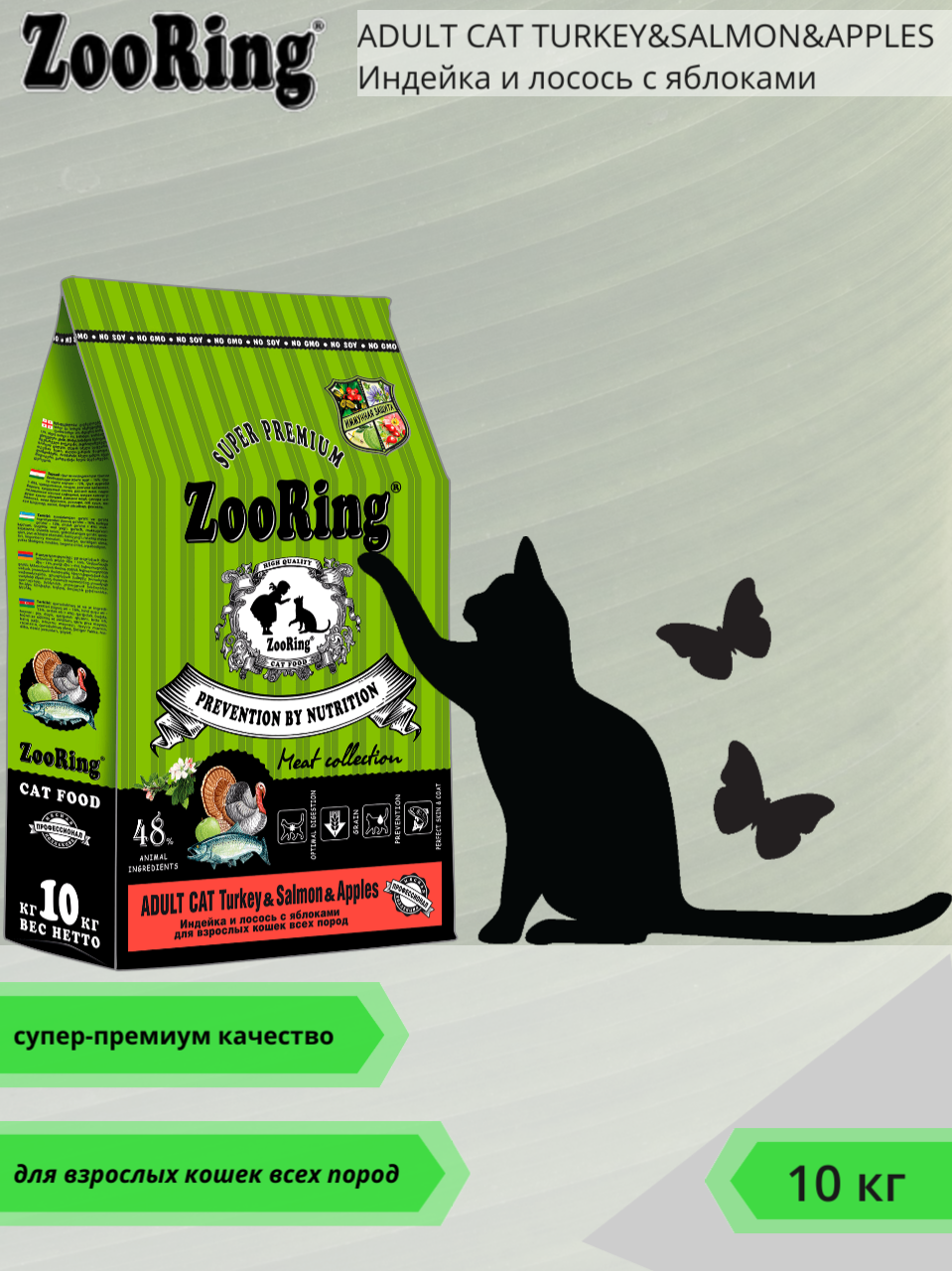 Сухой корм ZooRing ADULT CAT TURКEY индейка и лосось с яблоком для кошек, 10кг