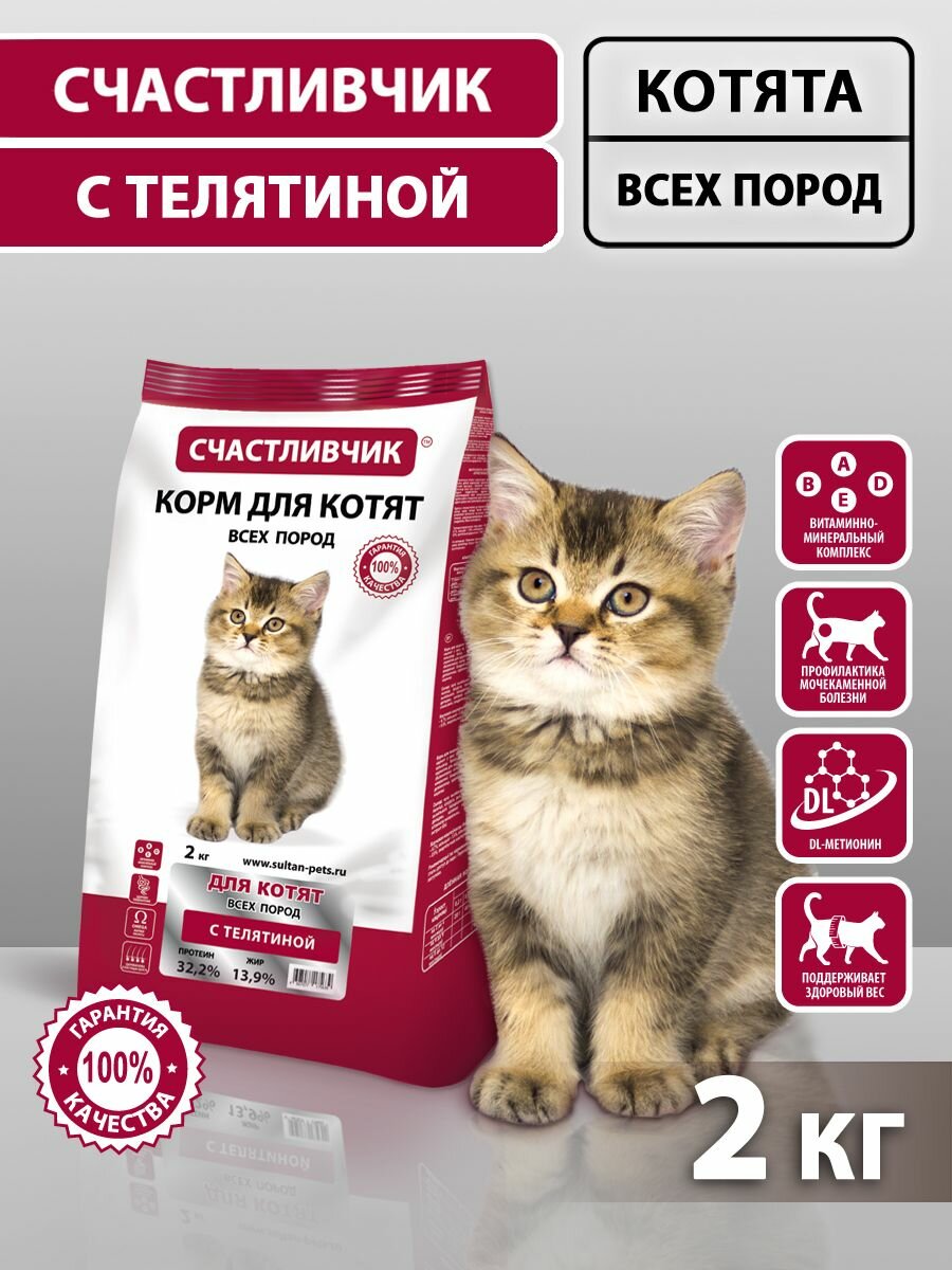 Корм для котят сухой, Счастливчик, с телятиной 2 кг