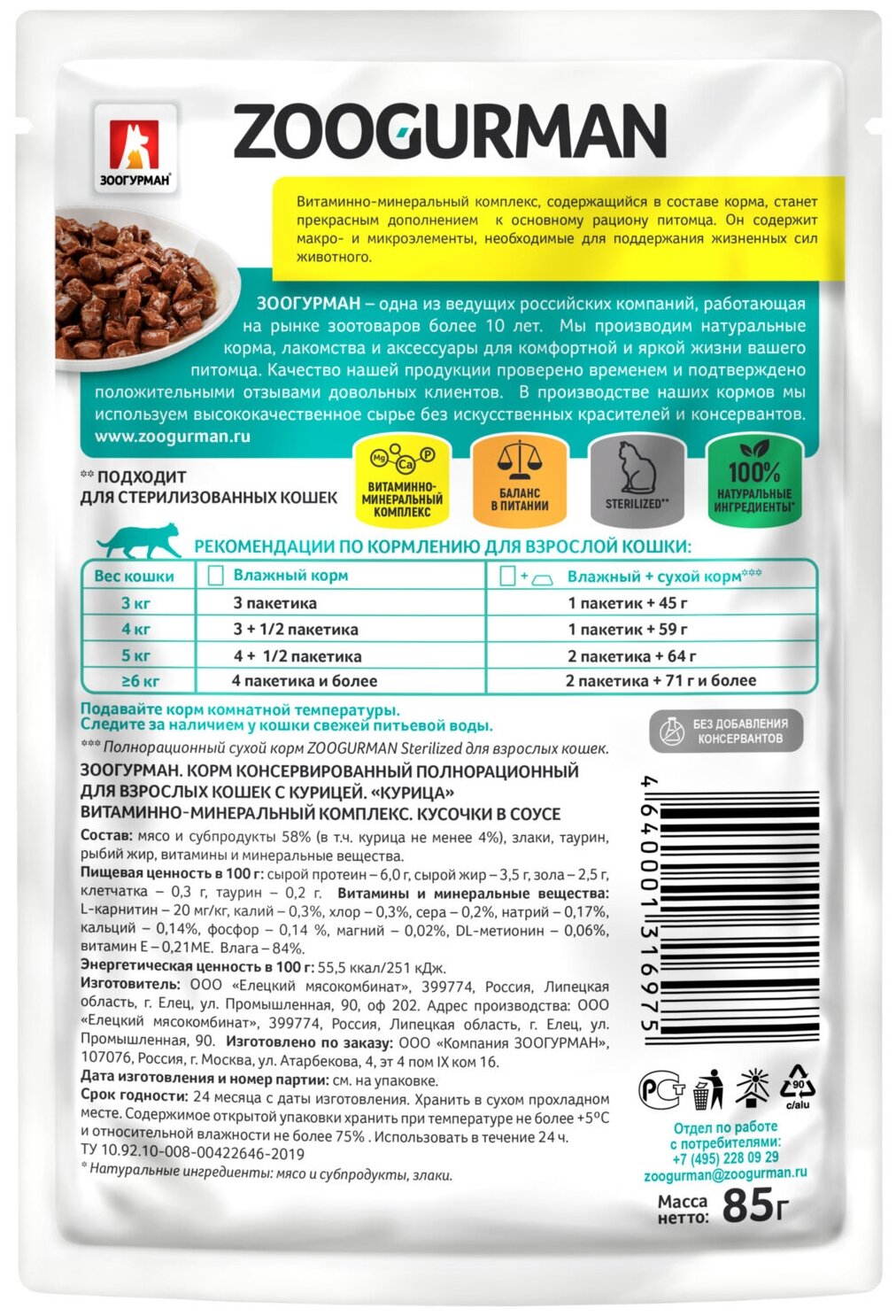 Купить Влажный корм zoogurman для стерилизованных кошек курица кусочки в соусе 85г 6975