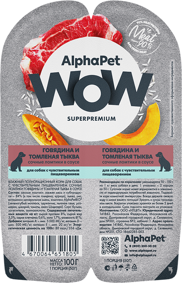 ALPHAPET WOW SUPERPREMIUM 100 гр ламистер влажный корм для собак с чув. пищ гов. и томленая тыква 1х15