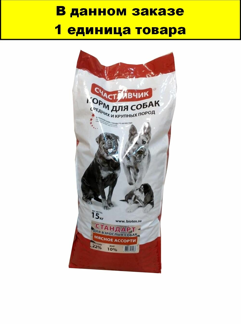 Сухой корм для собак Счастливчик мясное ассорти 1 уп. х 1 шт. х 15 кг (для средних и крупных пород)