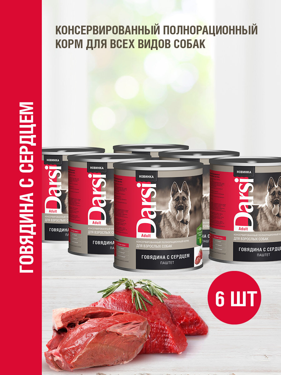 Влажный корм для собак Darsi паштет, говядина, сердце 6 шт. х 850 г