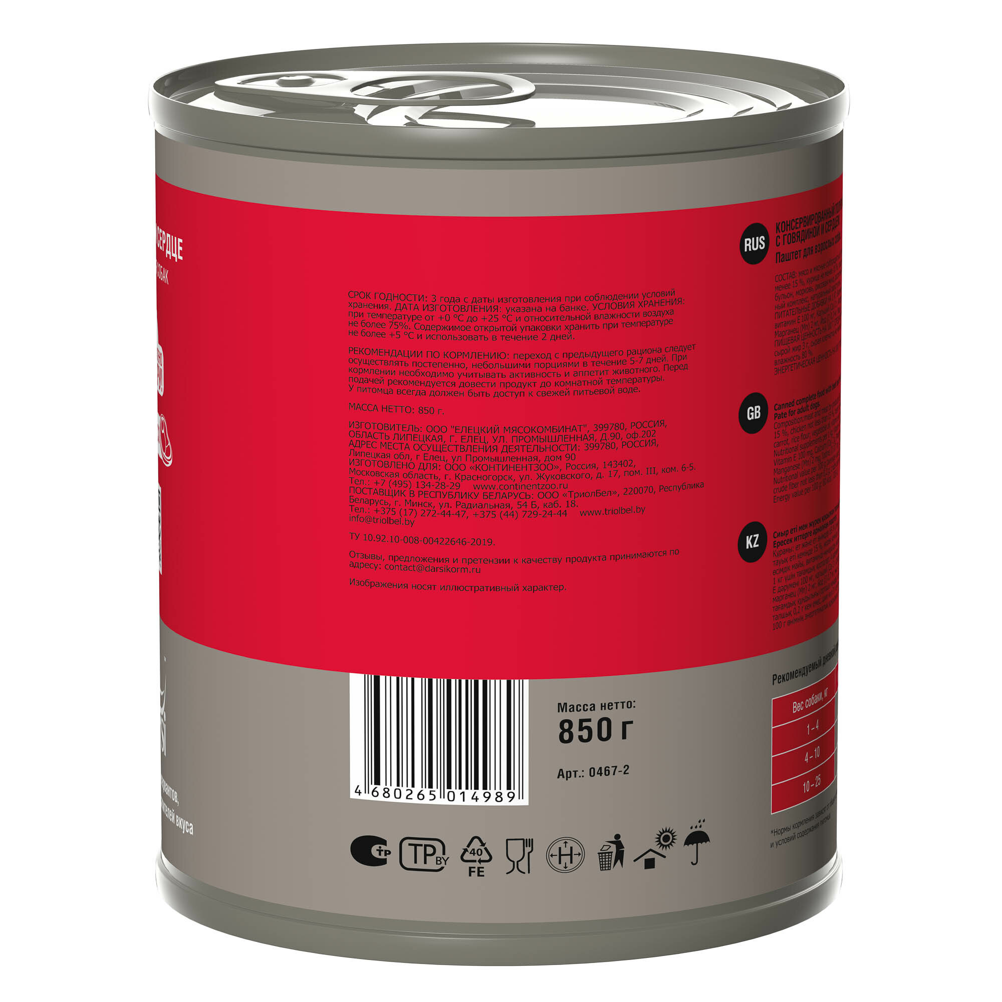 Darsi Консервы для собак, говядина и сердце, 850 г, 3 штуки