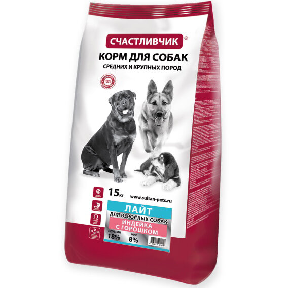 Счастливчик лайт сухой корм для собак, индейка с горошком, 15 кг
