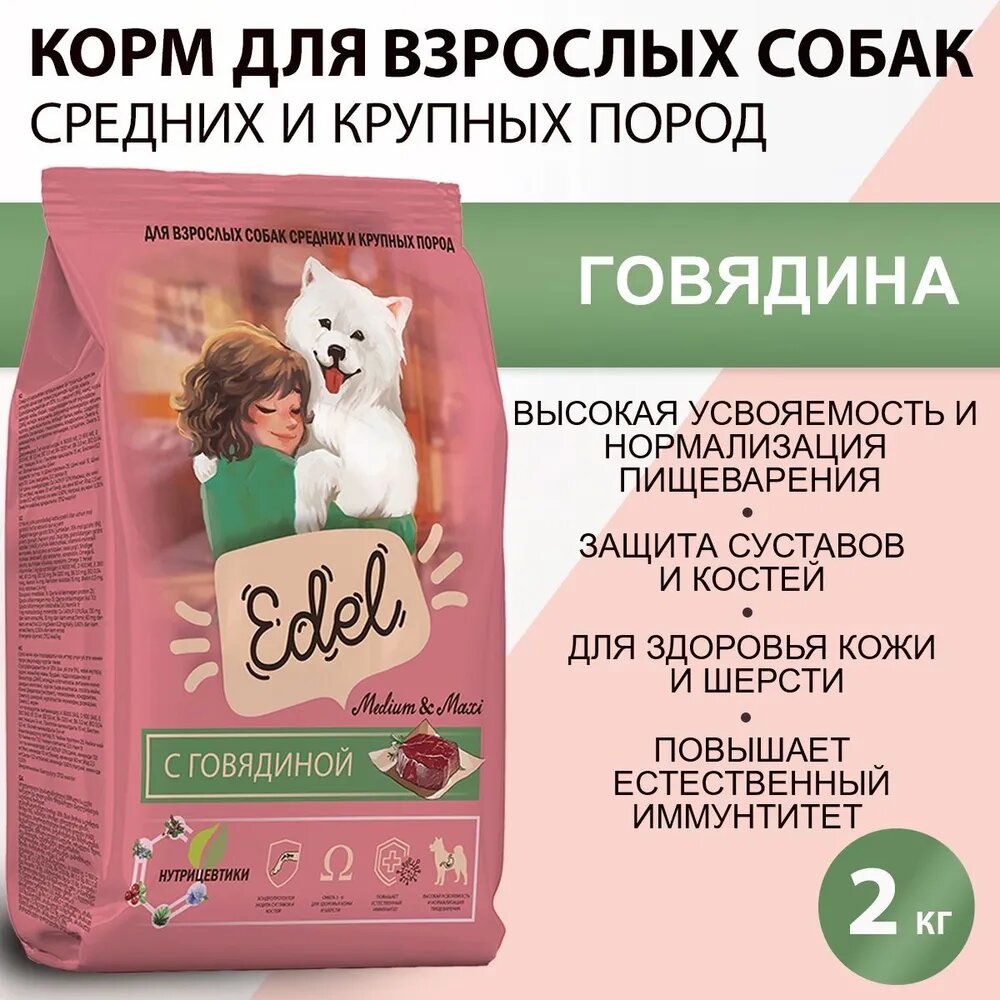 Сухой корм EDEL для взрослых собак средних и крупных пород, с говядиной Adult Medium & Maxi Beef 2 кг