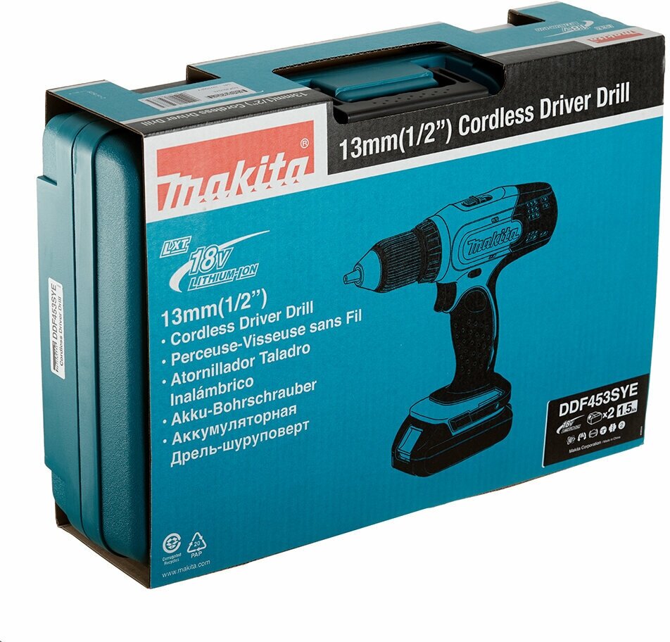 Дрель-шуруповерт Makita DDF453SYE, 1.5Ач, с двумя аккумуляторами