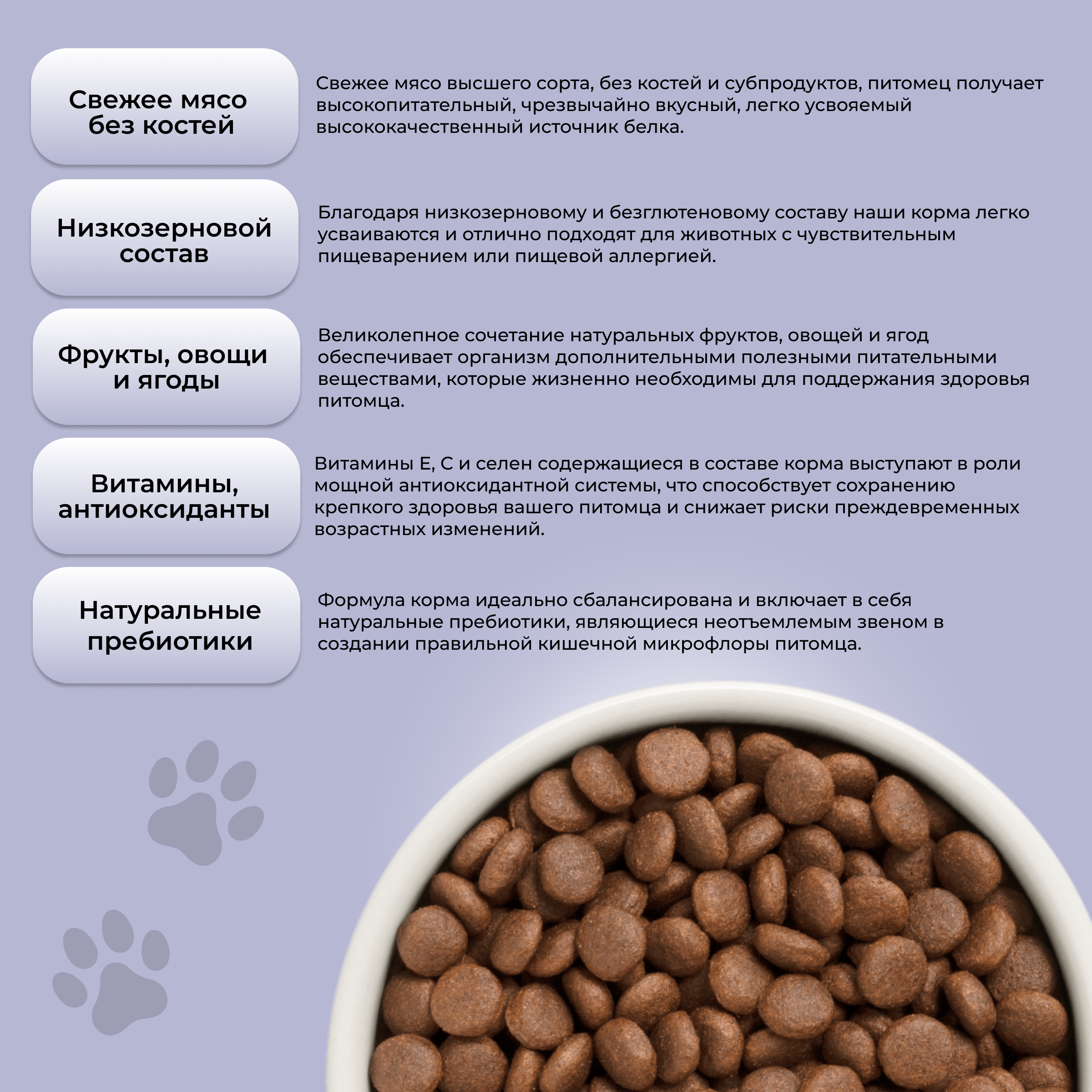 | Особые потребности | беззерновой / гипоаллергенный / для активных животных / для беременных/кормящих / для здоровья кожи и блеска шерсти / для здоровья костей и суставов / для снижения запаха стула / для ухода за ротовой полостью / при чувствительном пищеварении |