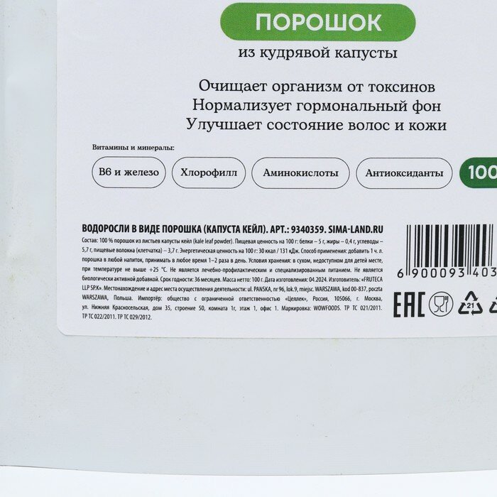 Купить Кейл Onlylife в порошке из листьев кудрявой капусты, детокс, иммунитет, 100 г.