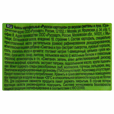 | Состав | картофель, специально приготовленный, масло растительное (соевое) рафинированное дезодорированное, комплексная пищевая добавка «Сметана и укроп» (соль, луковый порошок, мальтодекстрин, цельное сухое молоко, усилитель вкуса и аромата: глутамат натрия 1-замещенный, обезжиренное молоко, декстроза, зелень в т.ч. укроп, сметана (порошок), сыр (порошок), гидрогенизированное рапсовое масло, ароматизаторы, агент антислеживающий: диоксид кремния аморфный, краситель: экстракт паприки, регуляторы кислотности: молочная кислота, лактат кальция, крупа пшеничная |