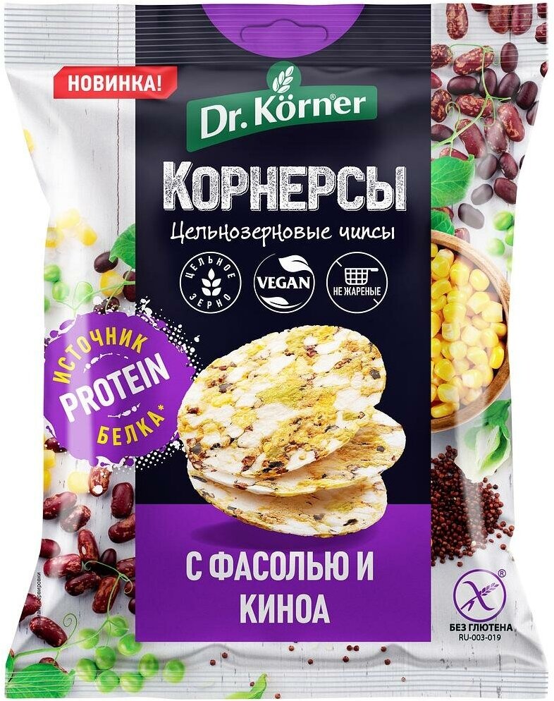 СохранитьЧипсы Dr.Korner кукурузно-рисовые с горошком, фасолью и киноа 50г интересное: