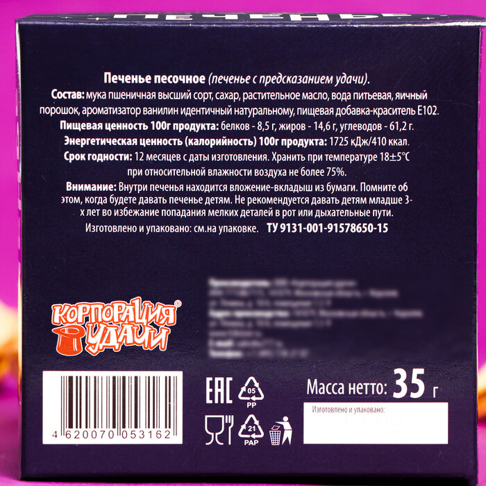 Песочное печенье с предсказанием, коробка в шубере "Умное печенье" 35 г,