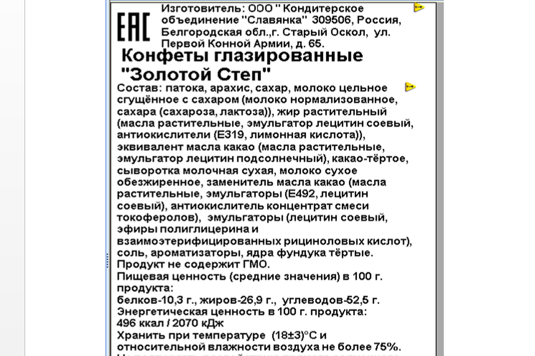 | Состав | арахис, патока, сахар, молоко цельное сгущенное с сахаром (молоко цельное, молоко обезжиренное, сахара, (сахароза, лактоза)), жир растительный (масла растительные, антиокислители (Е319, кислота лимонная)), эквивалент масла какао (масла растительные, эмульгатор лецитин соевый, антиокислители (Е306, кислота лимонная)), сыворотка молочная сухая, какао тертое, молоко сухое обезжиренное, эмульгаторы (лецитин соевый, Е476), заменитель масла какао (масла растительные, эмульгаторы (Е492, лецитин соевый), антиокислитель Е306), соль, ядра фундука тертые, ароматизаторы, какао-порошок |