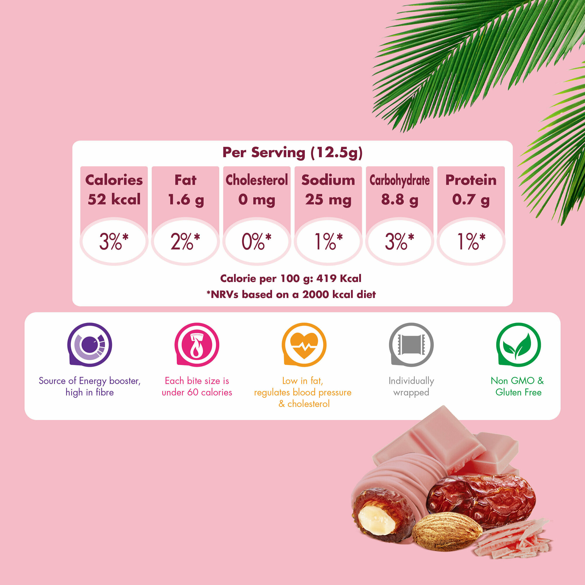 | Состав | финики сушеные, белый шоколад (сахар, какао масло, цельное сухое молоко, обезжиренное сухое молоко, молочный жир, эмульгатор: лецитин (соевый), Е476; натуральный ароматизатор - ваниль), карамель (цельное сухое молоко, обезжиренное сухое молоко, молочный жир, глюкоза, гидрогенизированное растительное масло, сахар, регулятор кислотности: гидрокарбонат натрия, лимонная кислота; соль, эмульгатор: лецитин (соевый), натуральный ароматизатор - ваниль), молочный шоколад (сахар, какао масло, цельное сухое молоко, какао тертое, обезжиренное сухое молоко, какао порошок, молочный жир, эмульгатор: лецитин (соевый), натуральный ароматизатор - ваниль, эмульгатор: Е476), миндаль, соль. Может содержать следы арахиса. |