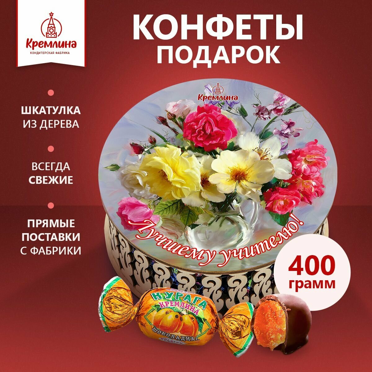 Подарок новогодний, набор подарочных конфет учителю Курага Шоколадная в резной шкатулке "Лучшему Учителю", 400 грамм