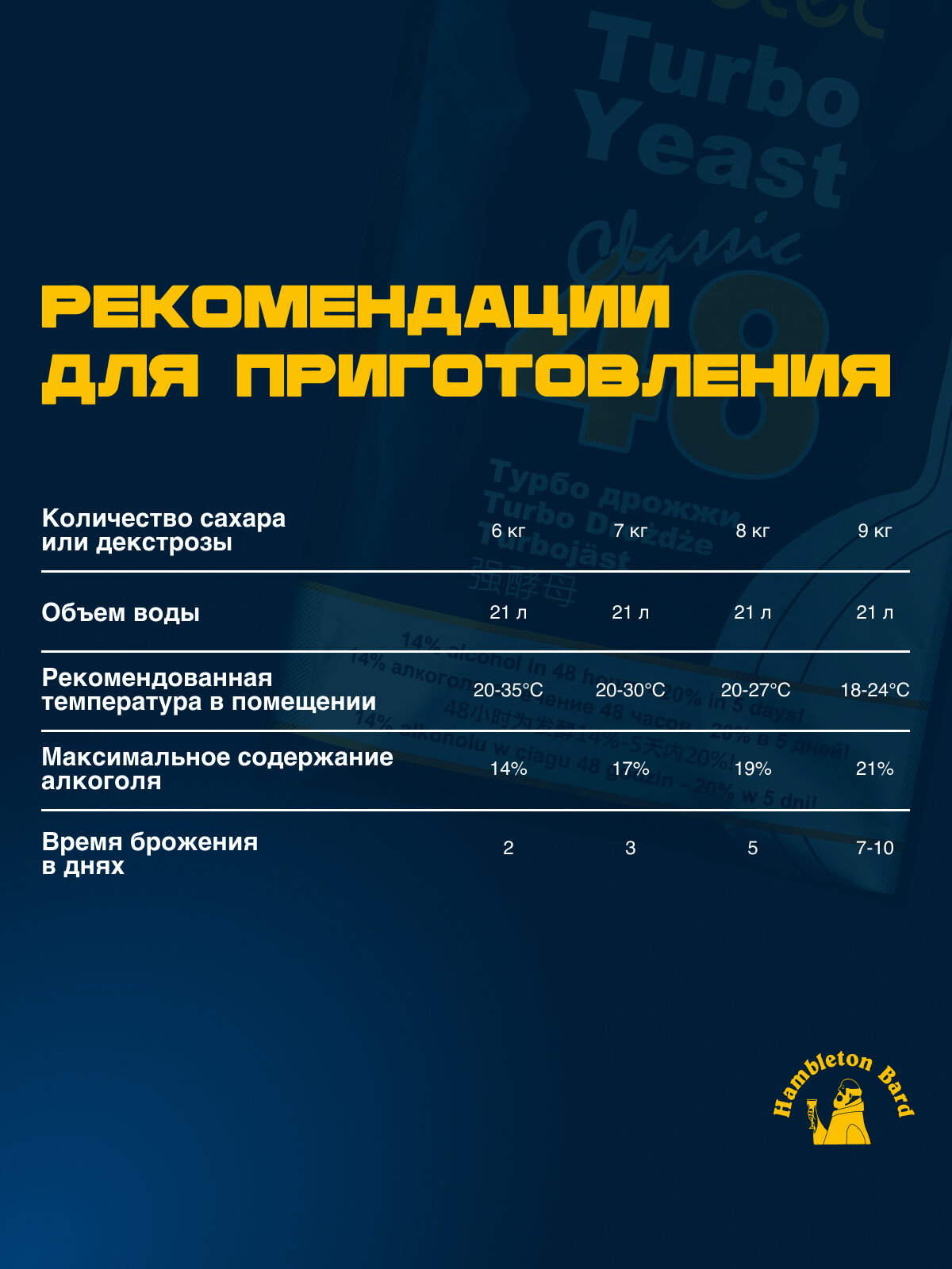 | Дополнительная информация | инструкция: налейте 15 л воды t 25 °С в ферментер. Добавьте необходимое количество сахара (согласно таблице) и размешайте до полного растворения. Доведите общий объём воды до 25 л и обеспечьте необходимую согласно таблице температуру. Всыпьте в раствор дрожжи. Не закрывайте ферментер плотно и не используйте гидрозатвор. Чтобы получить брагу крепостью 21% необходимо постоянно поддерживать температуру в пределах 18-24°С. Для обеспечения этого условия необходимо специальное охлаждающее оборудование. |