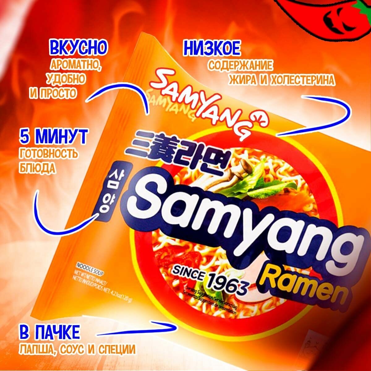 Лапша Самьянг x3 Spicy, Самая острая Корейская Огненная лапша, Халяль, 5 пачек по 140г