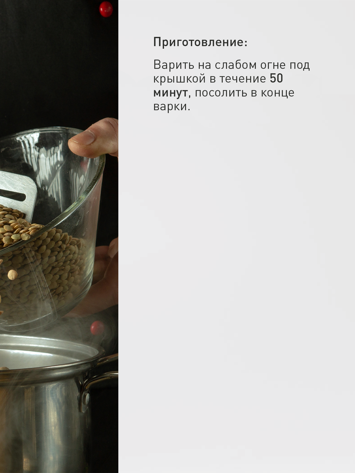 | Способ приготовления | Варить на слабом огне под крышкой в течение 50 минут, посолить в конце варки. |