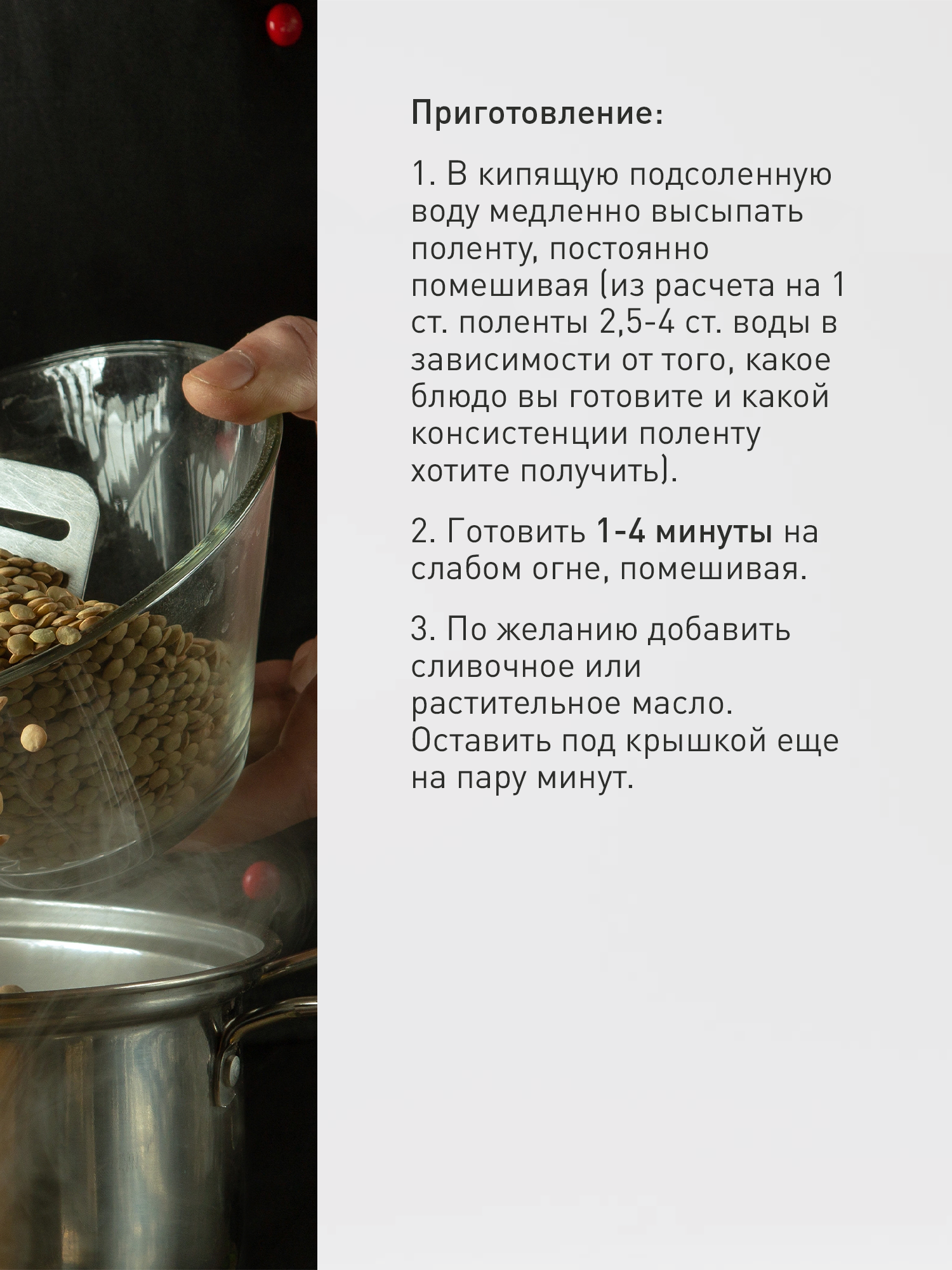 | Способ приготовления | Довести до кипения воду, всыпать крупу и готовить на медленном огне 4-5 минут, помешивая. |