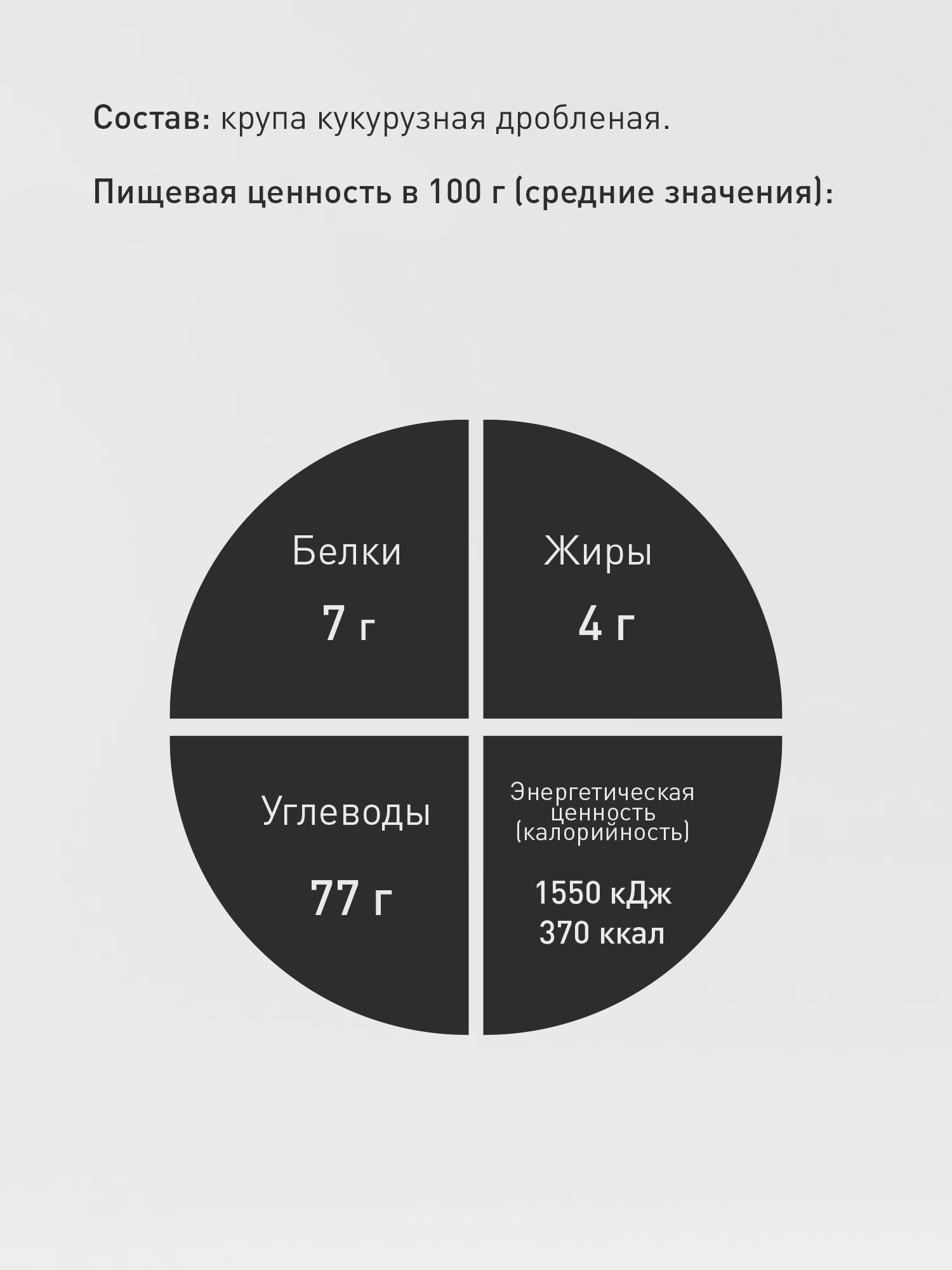 | Состав | полента. Может содержать следы глютена, сельдерея, сои, горчицы, арахиса, кунжута, орехов, молока и продуктов его переработки, яиц и продуктов их переработки. |