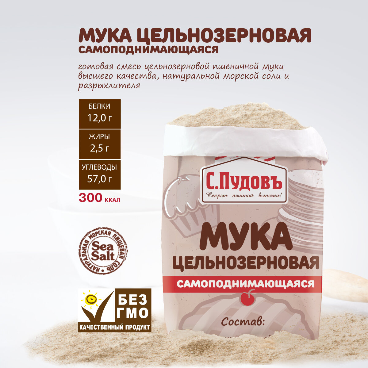 Мука цельнозерновая самоподнимающаяся пшеничная хлебопекарная С. Пудовъ, 1 кг интересное: