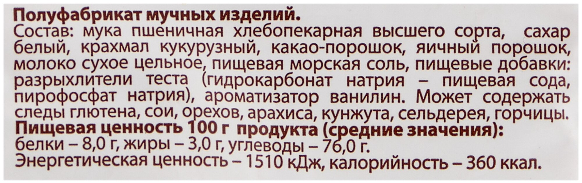 | Состав | мука пшеничная хлебопекарная высшего сорта, сахар белый, крахмал кукурузный, какао-порошок, яичный порошок, молоко сухое цельное, пищевая морская соль, разрыхлители теста (гидрокарбонат натрия - пищевая сода, пирофосфат натрия), ароматизатор ванилин. Может содержать следы глютена, сои, орехов, арахиса, кунжута, сельдерея, горчицы. |