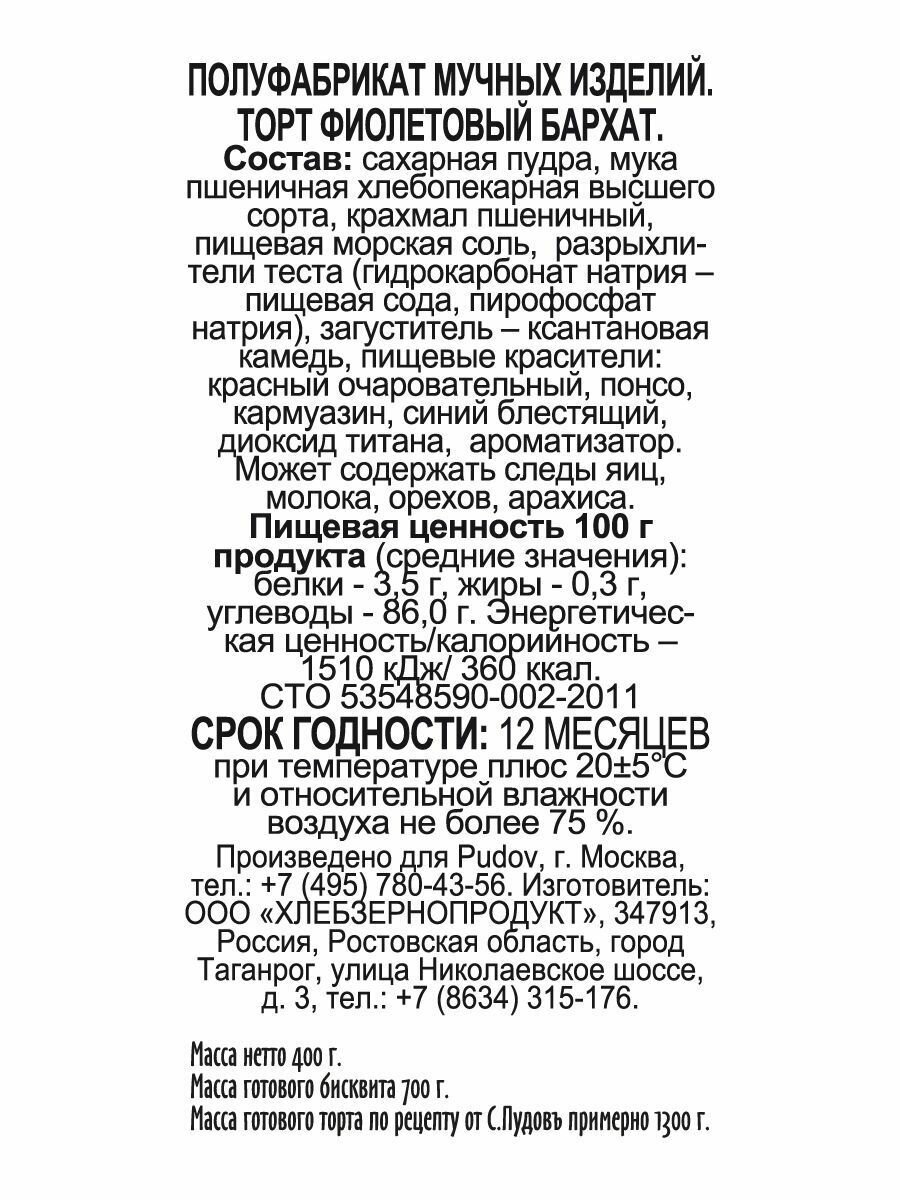 Ниже Вы можете прочитать отзывы на Смесь для выпечки Торт Фиолетовый бархат С.Пудовъ, 400 г, ознакомится с подробными характеристиками, посмотреть интересные обзоры и фотографии на Смесь для выпечки Торт Фиолетовый бархат С.Пудовъ, 400 г.