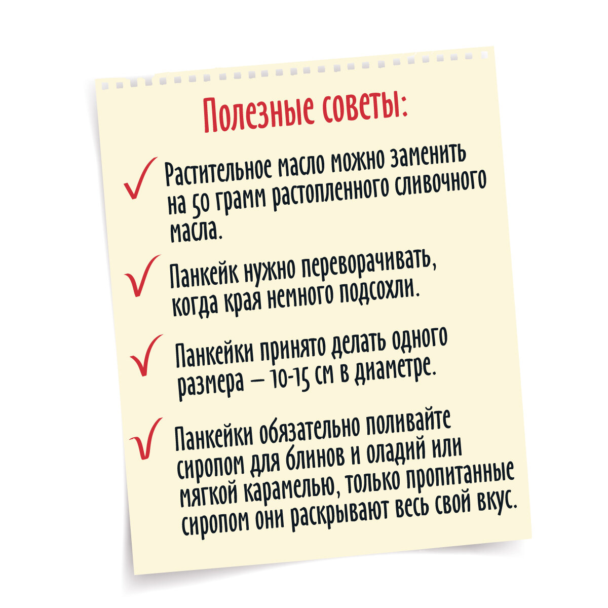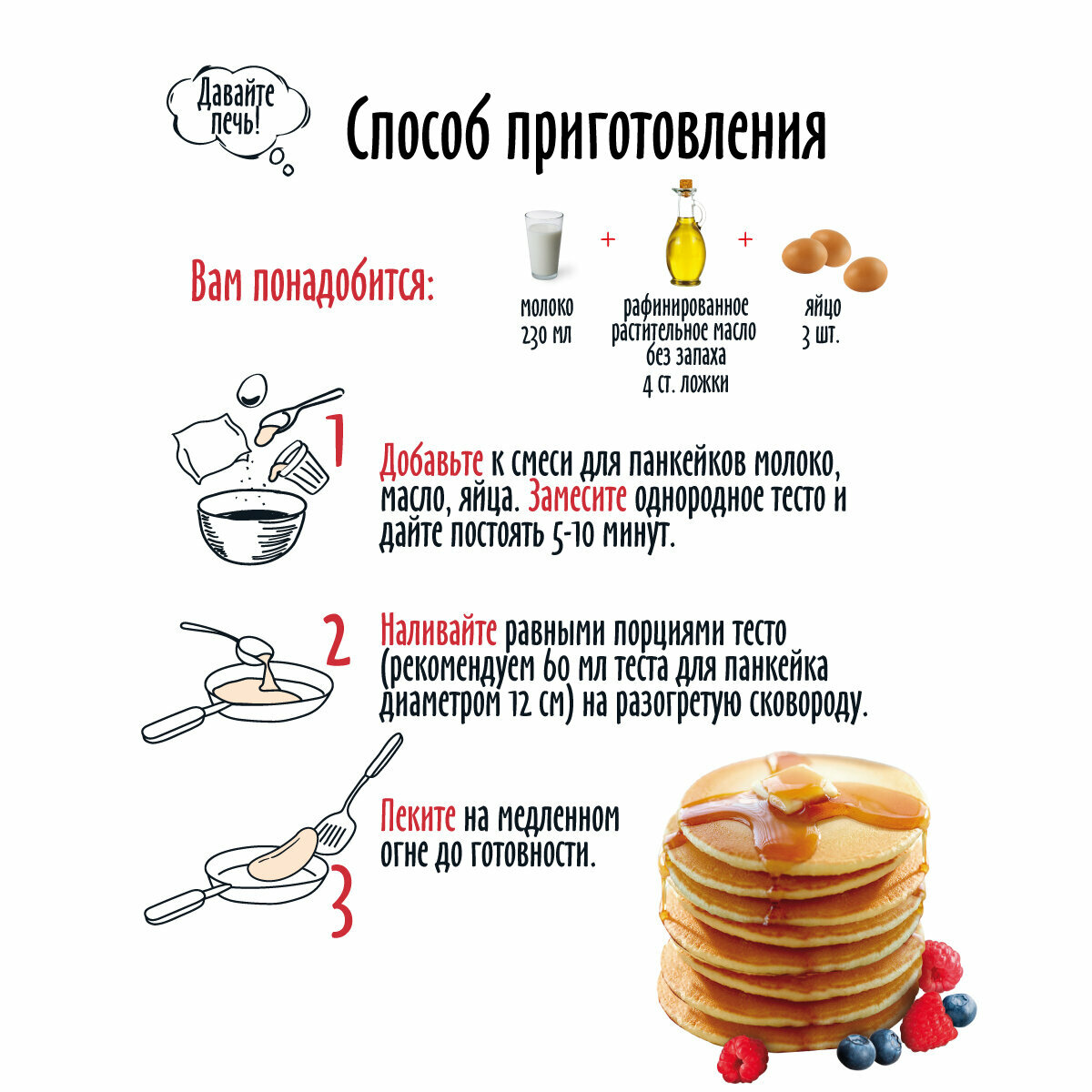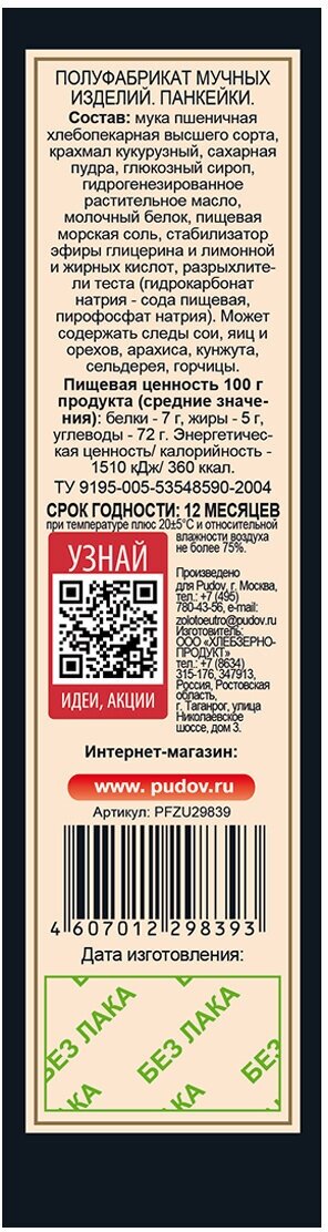 | Дополнительная информация | Способ приготовления: Смешайте: смесь для Панкейков, 3 яйца, 230 мл молока комнатной температуры и 4 ст.л. растительного масла(или 50 г растопленного сливочного масла). Замесите однородное тесло и дайте ему постоять 5-10 минут. Наливайте порциями около 60 мл (для Панкейков диаметром 12 см) на горячую сковороду, слегка смазанную маслом. Выпекайте на медленном огне с обеих сторон до готовности. Панкейки обычно делают одинакового размера 10-15 см. Готовый Панкейки выложите стопкой. Подавайте со сливочным маслом, сиропом, фруктами. Рассчитано на 15 панкейков диаметром 12-13 см. |