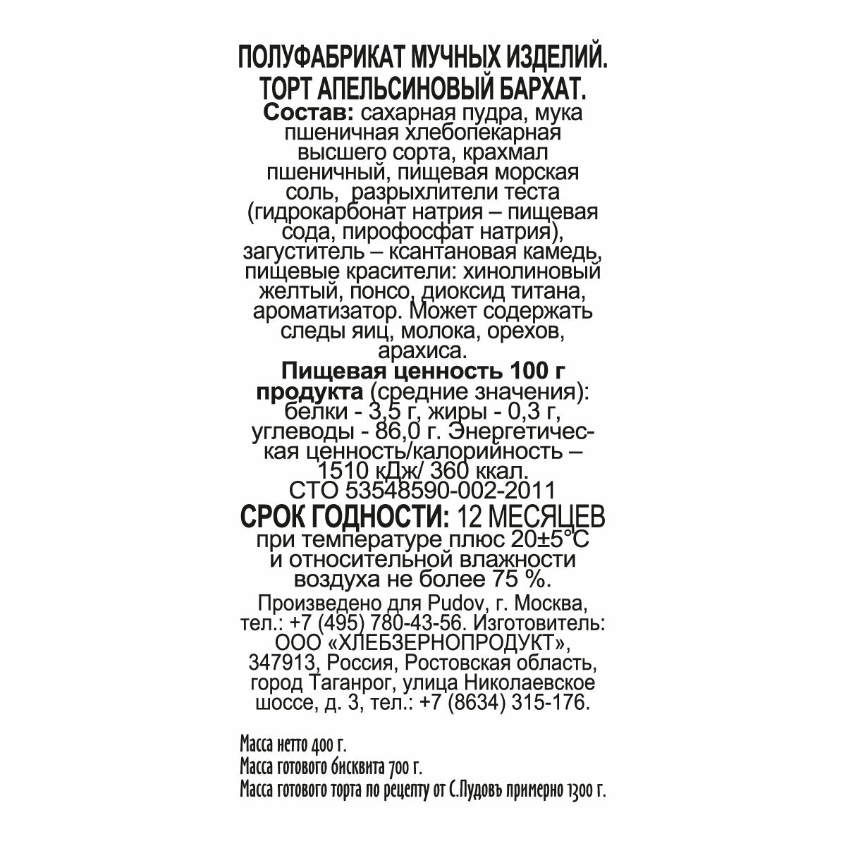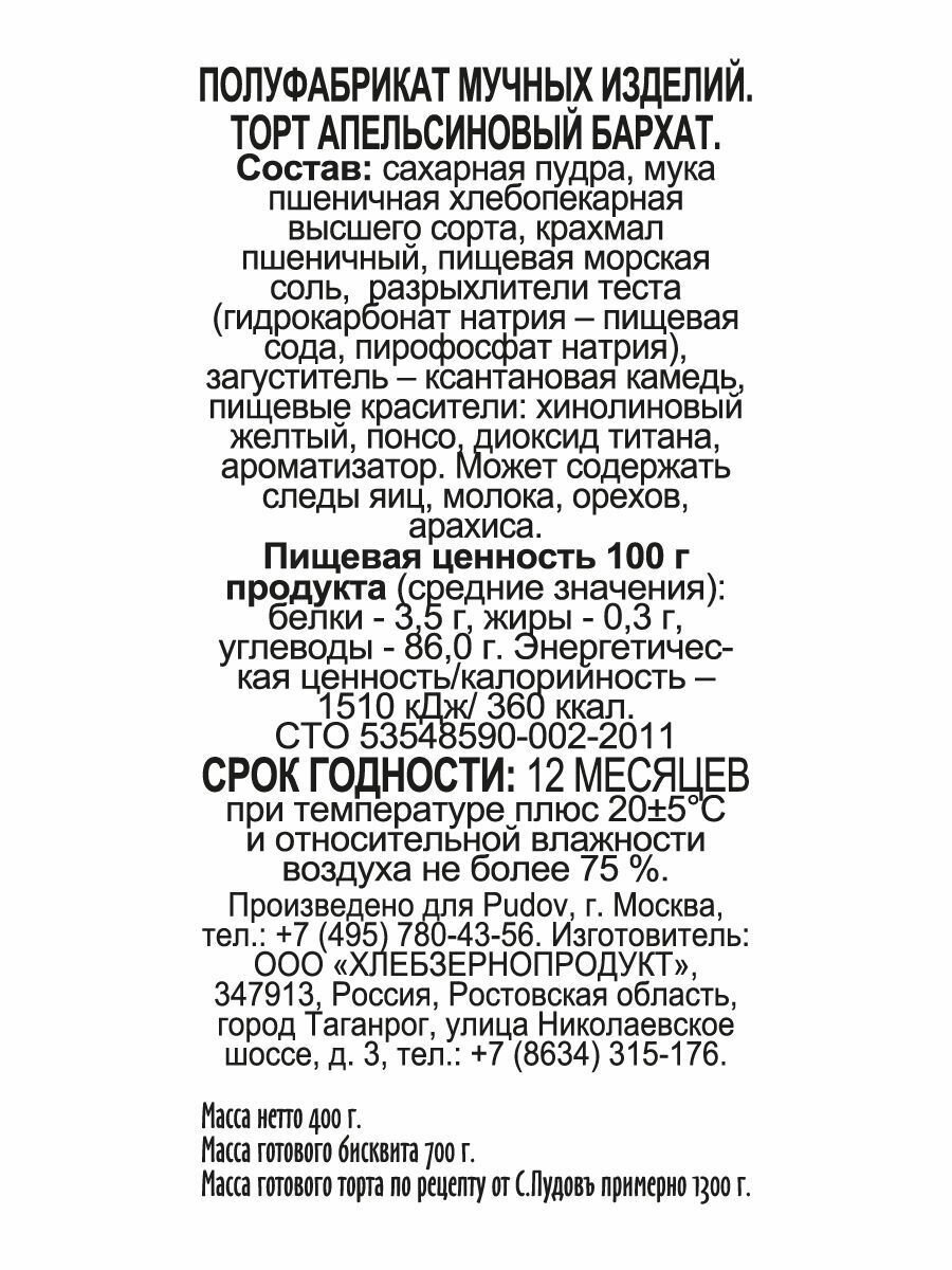 Торт Апельсиновый бархат С.Пудовъ, картон ритейл,400 г