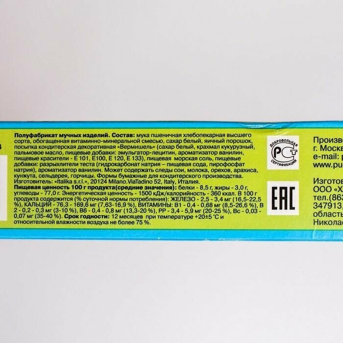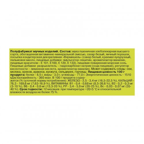 | Состав | мука пшеничная хлебопекарная высшего сорта, обогащенная витаминно-минеральной смесью, сахар белый, яичный порошок, посыпка кондитерская декоративная "Вермишель" (сахар белый, крахмал кукурузный, пальмовое масло, пищевые добавки: эмульгатор - лецитин, ароматизатор ванилин, пищевые красители - Е101, Е100, Е120, Е133), пищевая поваренная морская соль. Пищевые добавки: разрыхлитель - гидрокарбонат натрия (сода пищевая), регулятор кислотности - лимонная кислота, ароматизатор ванилин. Может содержать следы сои, молока, орехов, арахиса, кунжута, сельдерея, горчицы. |