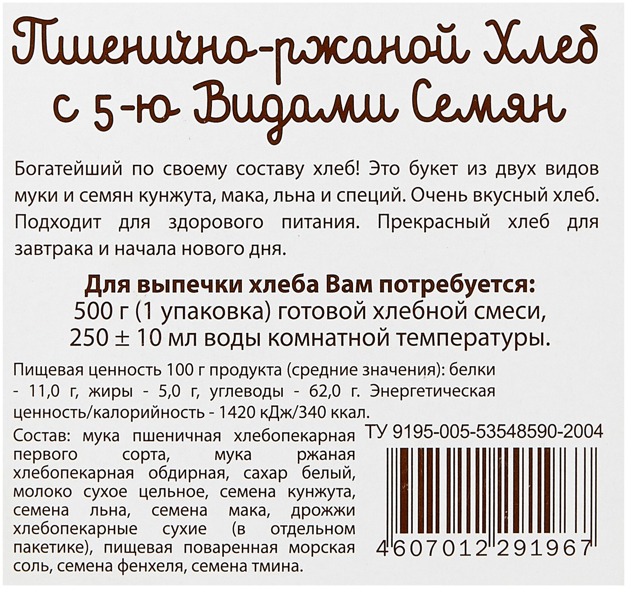 Смесь для выпечки хлеба "Пшенично-ржаной хлеб с 5-ю видами семян" С.Пудовъ , 500 г интересное: