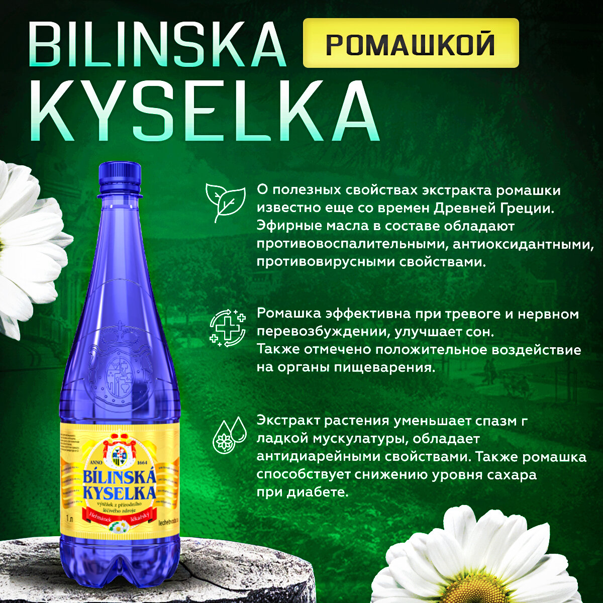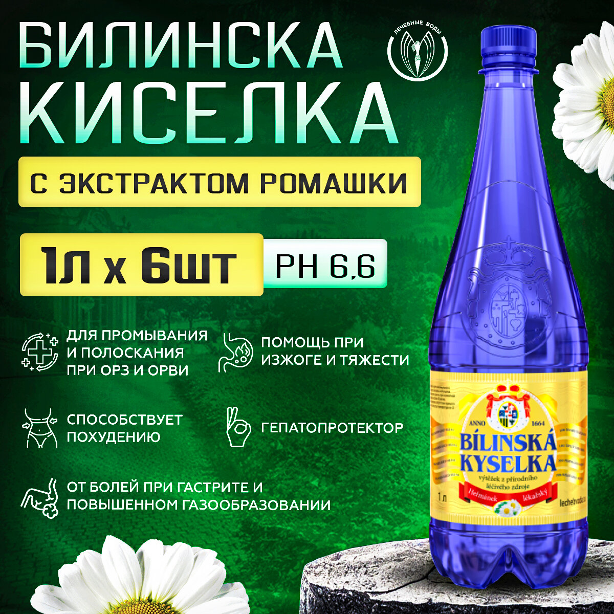 Купить Билинска Киселка c экстрактом Ромашки 1.0 л - 6 шт. Минеральная лечебно-столовая вода с природной газацией (Bilinska Kyselka), Рекомендована от изжоги, гастрите, СРК, ГЭРБ, дисбактериозе, холецистите