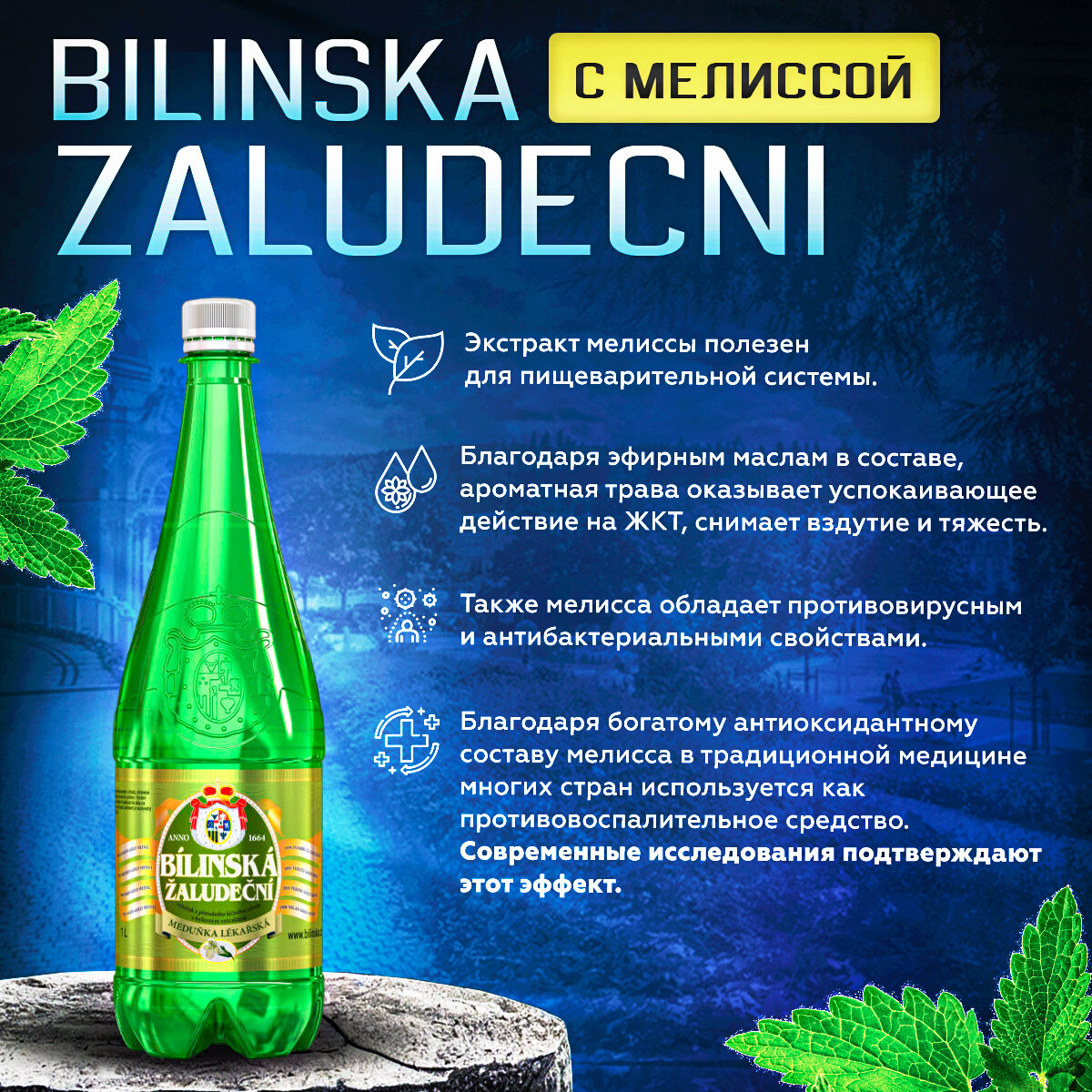 Минеральная лечебно-столовая вода с природной газацией Билинска Киселка (Bilinska Zaludechni) с экстрактом мелиссы 1.0 л - 6 шт.