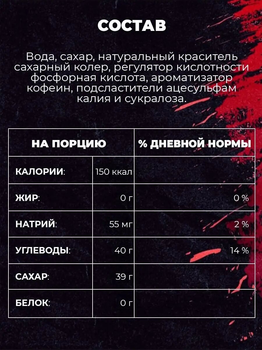 | Состав | газированная вода, высокофруктозный кукурузный сироп, карамельный колер, фосфорная кислота, натуральные и искусственные ароматизаторы-карамель, бензонат натрия (консервант), кофеин |