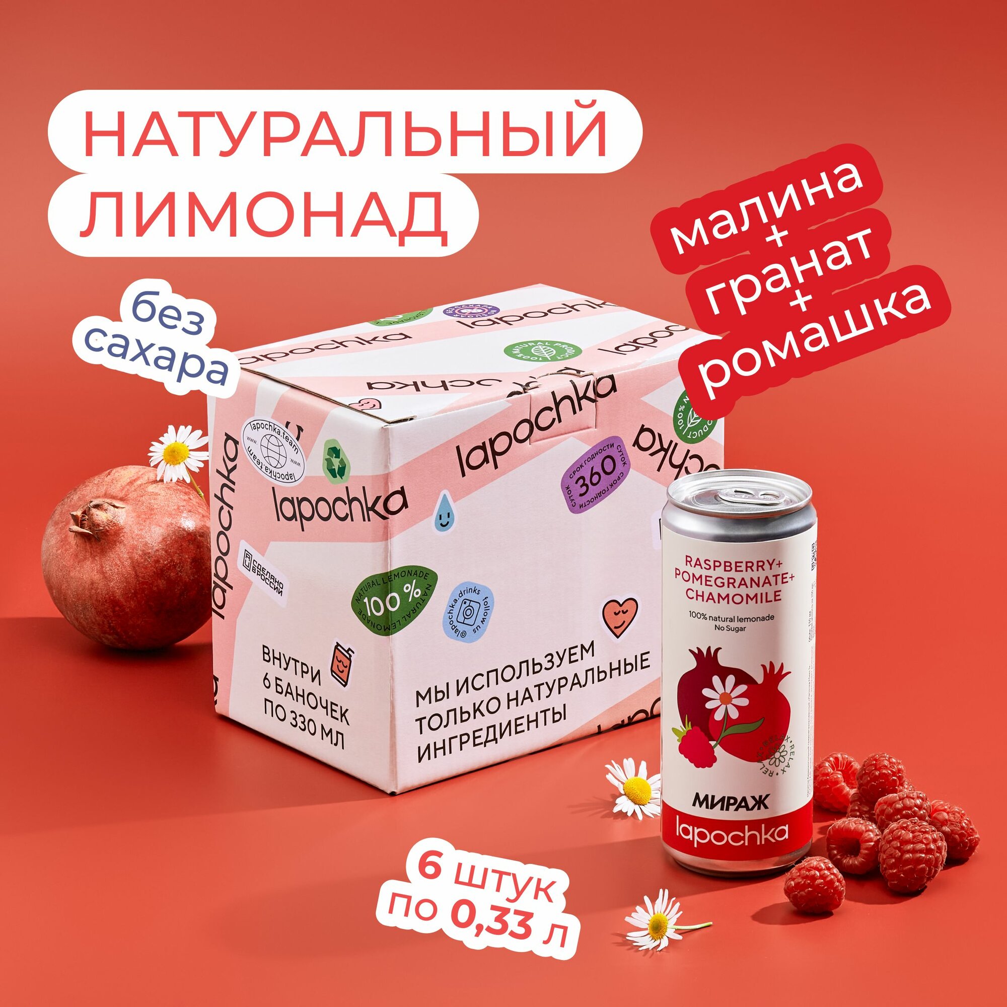 Купить Натуральный лимонад без сахара LAPOCHKA x мираж Малина + Гранат + Ромашка 6 x 0,33 л