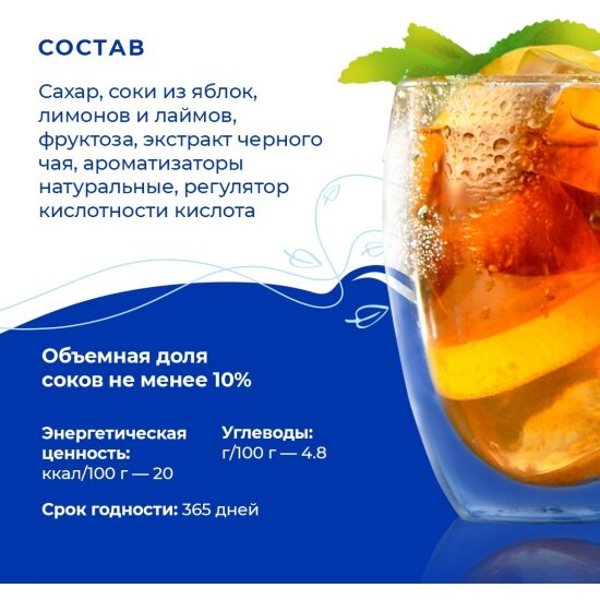 | Состав | Сахар, соки из яблок, лимонов и лаймов, фруктоза, экстракт черного чая, ароматизаторы натуральные, регулятор кислотности кислота лимонная, вода |