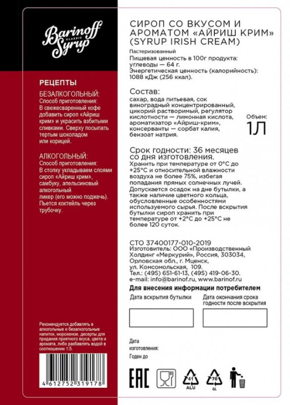 СохранитьСироп Barinoff Айриш Крим, для кофе и коктейлей, 1 л интересное: