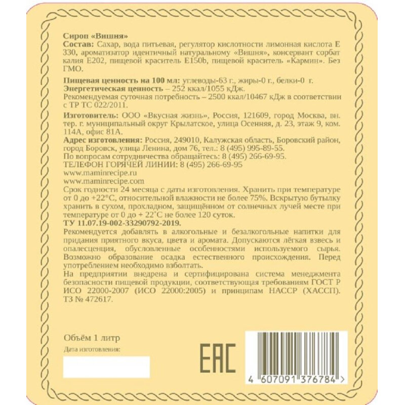 Купить Сироп Вишня мамин рецепт для кофе и коктейлей 1л, ПЭТ.