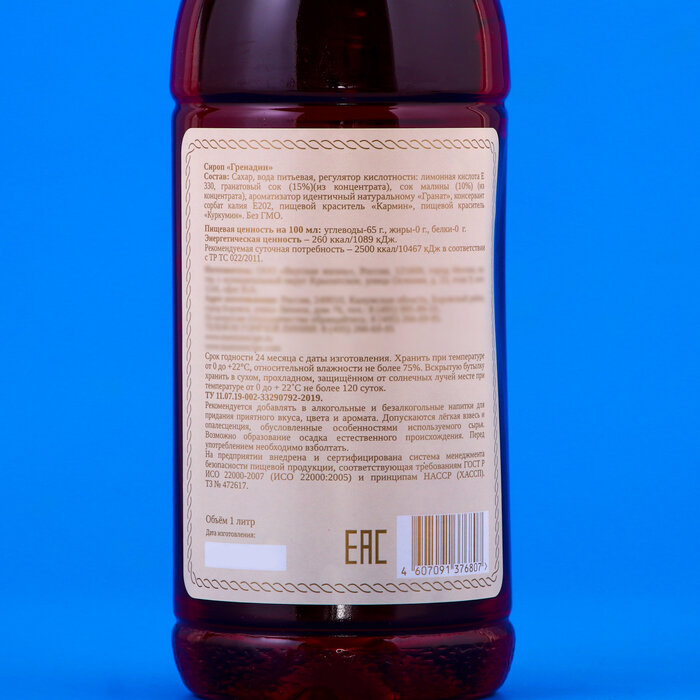 | Состав | сахар, вода питьевая, регулятор кислотности: лимонная кислота, ароматизатор, консервант сорбат калия, консервант бензоат натрия, пищевой краситель карамельный колер, пищевой краситель «Антоциан». Без ГМО. Пищевая ценность на 100 мл: углеводы – 63 г, жиры – 0 г, белки – 0 г. Энергетическая ценность – 252 ккал/1055 кДж. Рекомендуемая суточная потребность – 2500 ккал/10467 кДж в соответствии с ТР ТС 022/2011. |