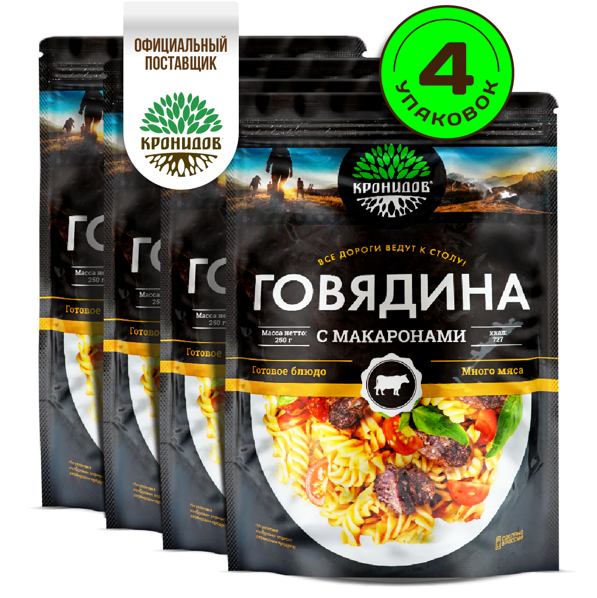 Купить Готовое блюдо в реторт-пакете "Говядина с макаронами" Кронидов Сухой паек для охоты, рыбалки, в поход Набор 4 шт. по 250 гр