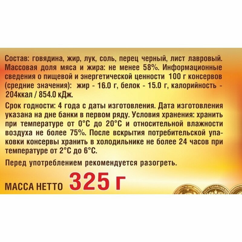| Состав | свинина, жир, лук, соль, перец черный, лист лавровый |