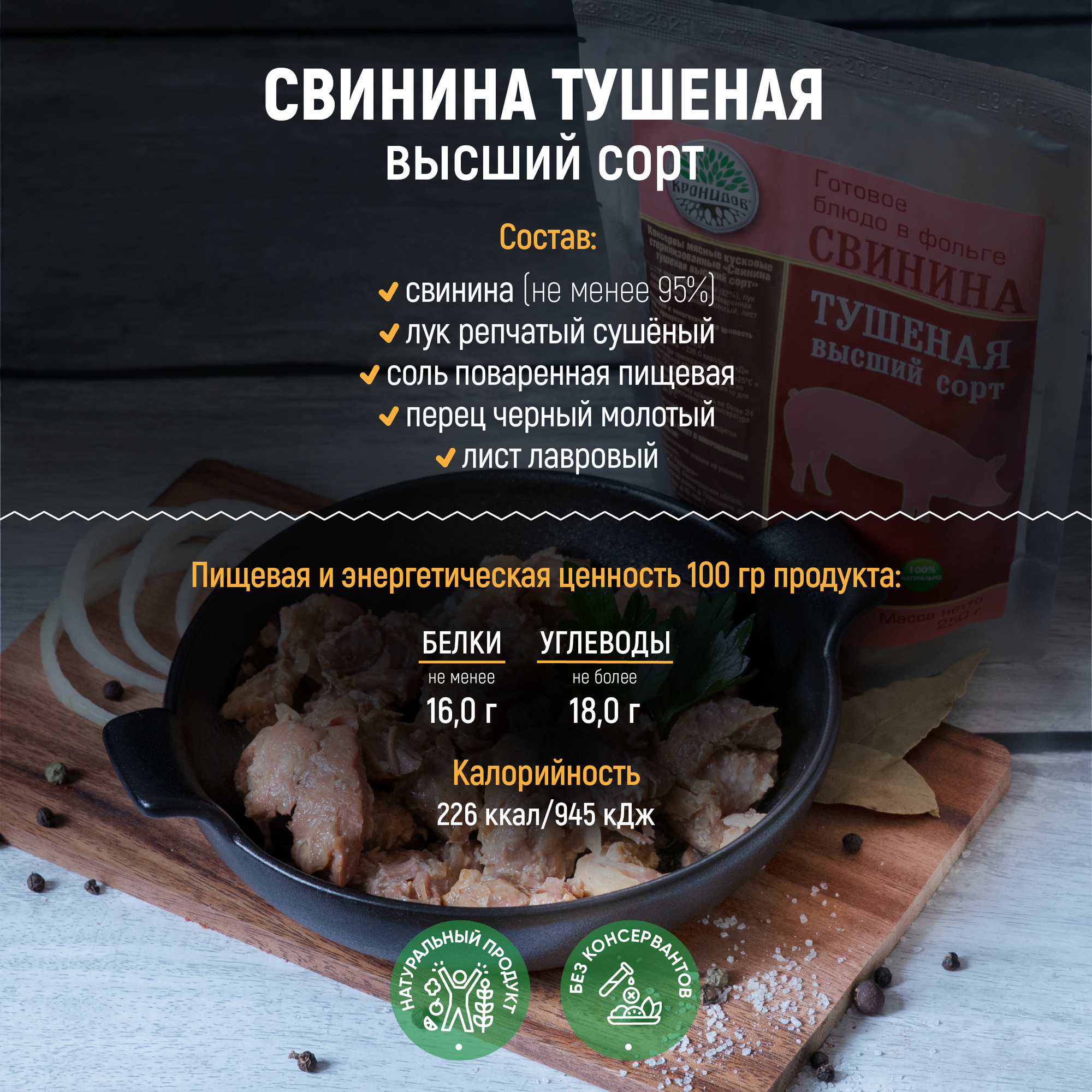 | Состав | лук репчатый, свинина, перец черный молотый, соль поваренная пищевая, лист лавровый |