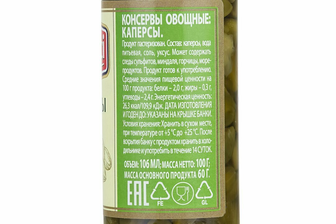 | Состав | каперсы, вода питьевая, соль, уксус |