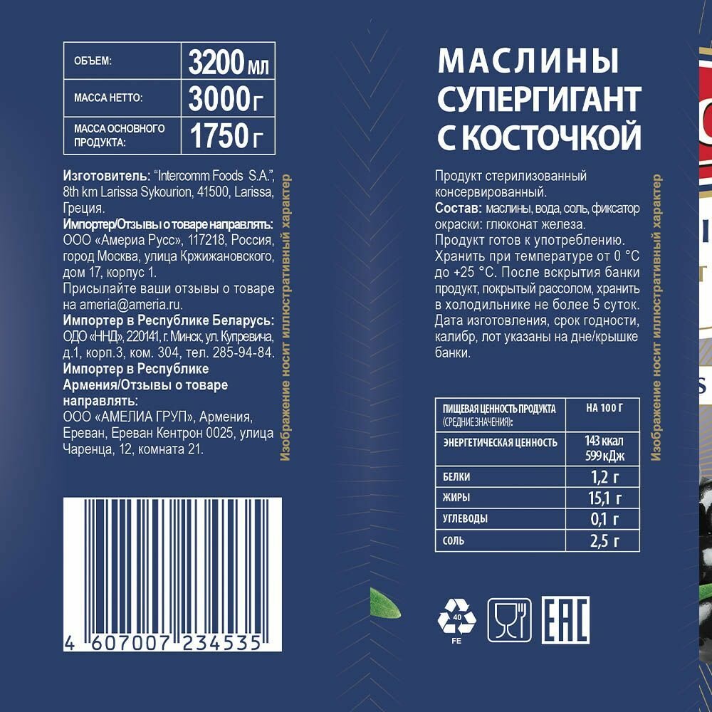 | Состав | маслины, вода, морская соль, фиксатор окраски: глюконат железа |