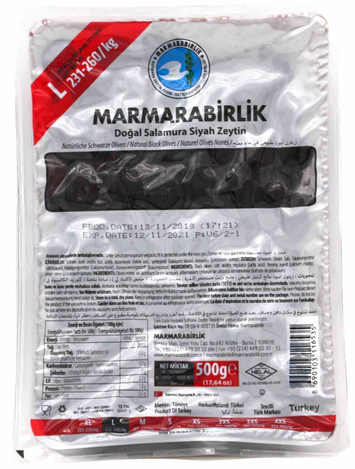 Маслины L-231-260 ваккум 200гр, Marmarabirlik, серая упак,