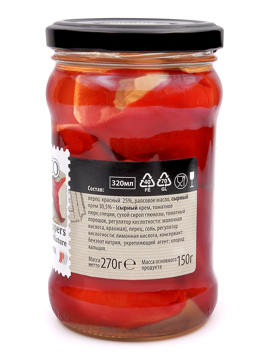 | Состав | перец красный 25%, рапсовое масло, сырный крем 30,6% (25,7% сырный крем жирность 50%, томатное пюре 2,6%, специи, сироп глюкозы, томатный порошок, молочная кислота, крахмал), консервант Е 211, укрепляющий агент: Е509, соль, лимонная кислота |