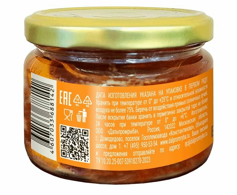 | Состав | Горбуша (Oncorhynchus gorbuscha), масло растительное, сахар, специи (имбирь, паприка, чеснок, лук, перец чили), соль поваренная пищевая, соевый соус высушенный, лимон (порошок), мальтодекстрин, гидролизованный растительный белок (из подсолнечника). |